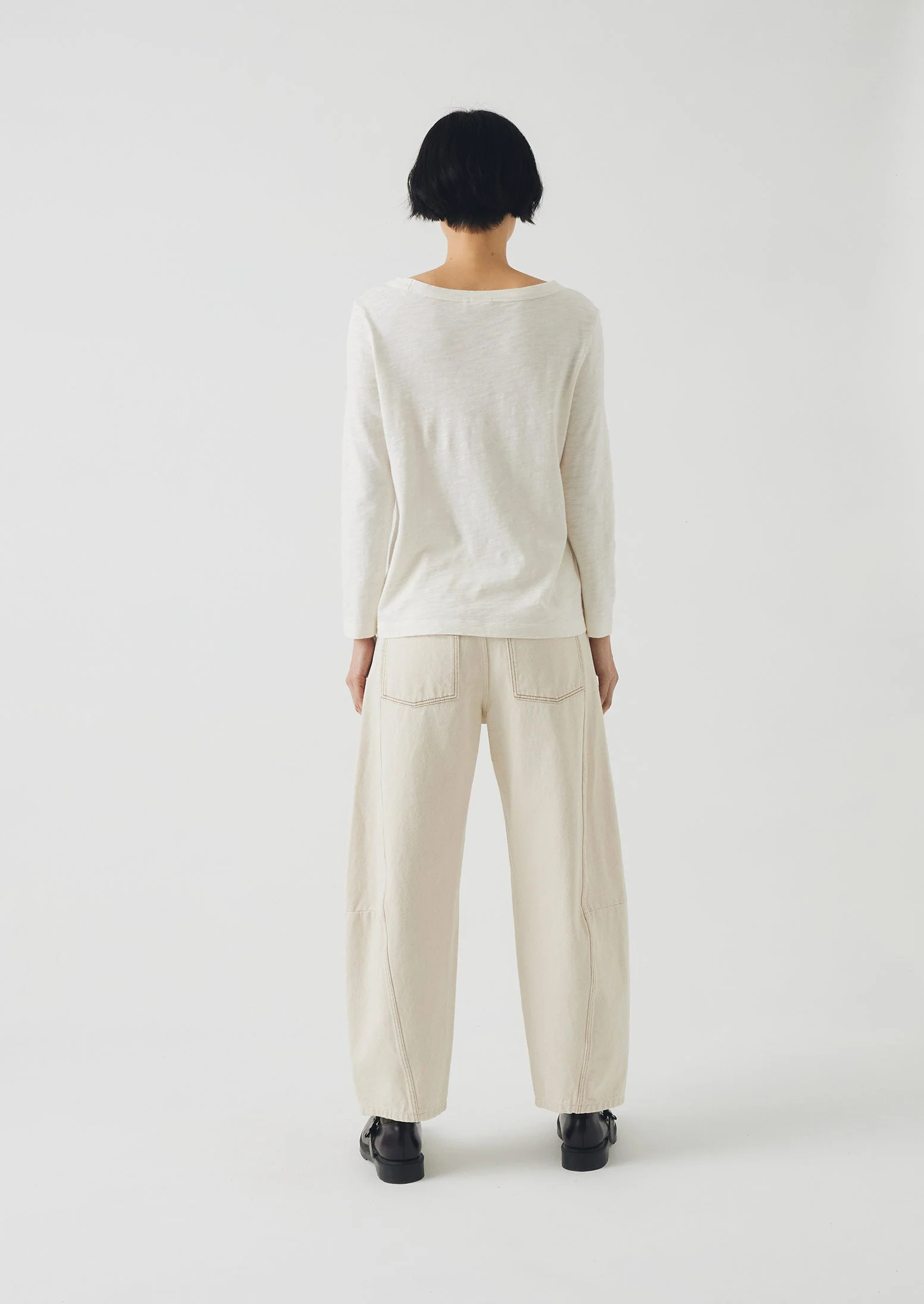 Our tee is crafted from organic cotton jersey with a slubbed texture in Portugal. Cut with a boat neckline and bracelet-length sleeves, then garment-dyed for a rich depth of colour. The tee is garment-dyed, a process that gives each piece a washed, crumpled texture and natural colour variations.